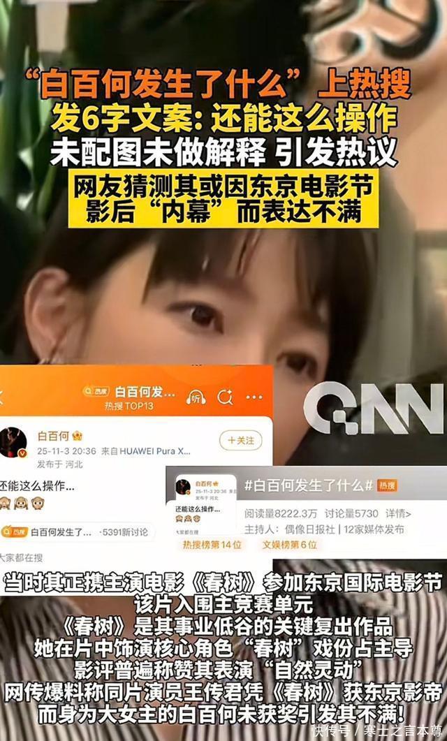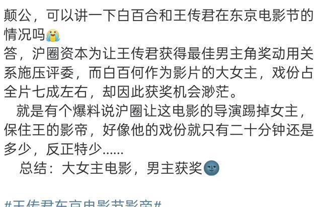 首先,白百合不常更新的微博突然出现了一条他自己编辑的文字, 暗含讽刺剧组不公的信息,后面还紧跟了几个捂脸的表情。 随后网友猜测白百何是不是遇见了什么不公平待遇,于是就有消息传出,原来王传君将要凭借《春树》获得东京影帝了。
