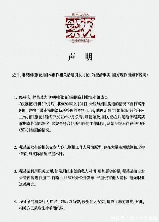 古二怎么可能去忍,他前前后后多次发文控诉,直到八九月份才引起大家注意,一石激起千层浪。 但《繁花》剧组也发出了声明,说古二只参与了前期一小部分创作,后面他根本就没有在公司了,说古二说的都是造假与诽谤。